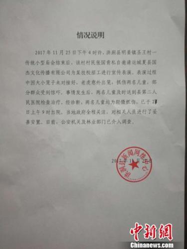 27日午時,洪洞縣新聞網絡中心發佈情況説明,11月25日下午4時許,洪洞縣明姜鎮聖王村一傳統小型廟會結束後,該村村民張某私自邀請運城夏縣某文化傳播有限公司為某技校招工進行宣傳表演。表演過程中因大小籠子未對接好,致使老虎意外出籠,抓傷兩名兒童,部分羣眾受到驚嚇。