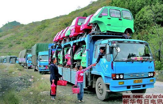 ▲秦蜀交界的陝西省寧強縣棋盤關因道路難行,108國道上的車輛常常長時間被堵塞途中(2002年10月23日攝)。10年前,西安至成都高速公路的全線通車,108國道上已不再堵塞。新華社記者陶明攝