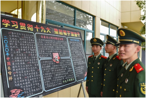 中隊張海波指導員介紹稱,在十九大召開後戰士們積極通過電視、報紙、網絡多種方式,深入和全面學習十九大報告,同時還採用自制板報等形式引導戰友牢記報告精神,中隊也專門製作學習貫徹十九大精神知識要點小冊子,利用訓練執勤的閒暇時間,動中抓教育,幫助戰士們學懂、學通十九大報告精神,貫徹到哨位的實踐中。