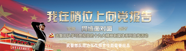 為充分展示十九大精神進軍營湧現的新實踐、新舉措、新風采。近日,武警部隊政治工作部在中央網信辦和軍委政治工作部網絡輿論局有力指導支持下,組織策劃了“我在哨位上向黨報告•網絡面對面”系列採訪宣傳活動,20餘家中央主流網媒和商業網站的編輯記者,來到東海之濱,跋涉西部天山,登上南海三沙,走進神州北極,踏上中原鄭州,深入武警部隊位於祖國東西南北中5個具有地標特點的執勤哨位,切身感受武警官兵學習宣傳貫徹黨的十九大精神的火熱場景,現場聆聽武警官兵在哨位上向黨報告的錚錚誓言!