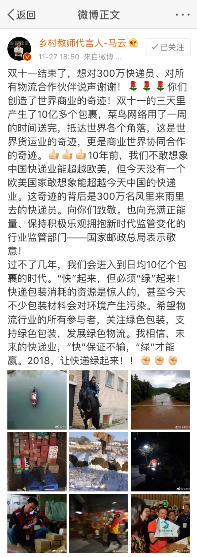 “未來的快遞業,‘快’保證不輸,‘綠’才能贏。2018,讓快遞綠起來!”馬雲在微博中説。