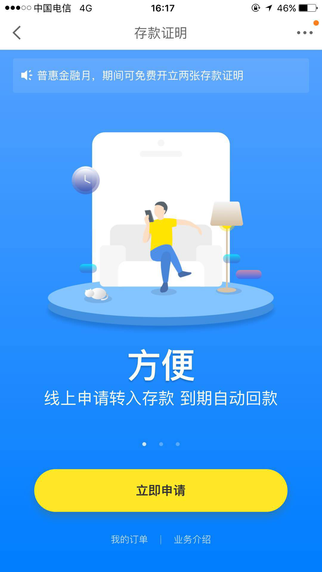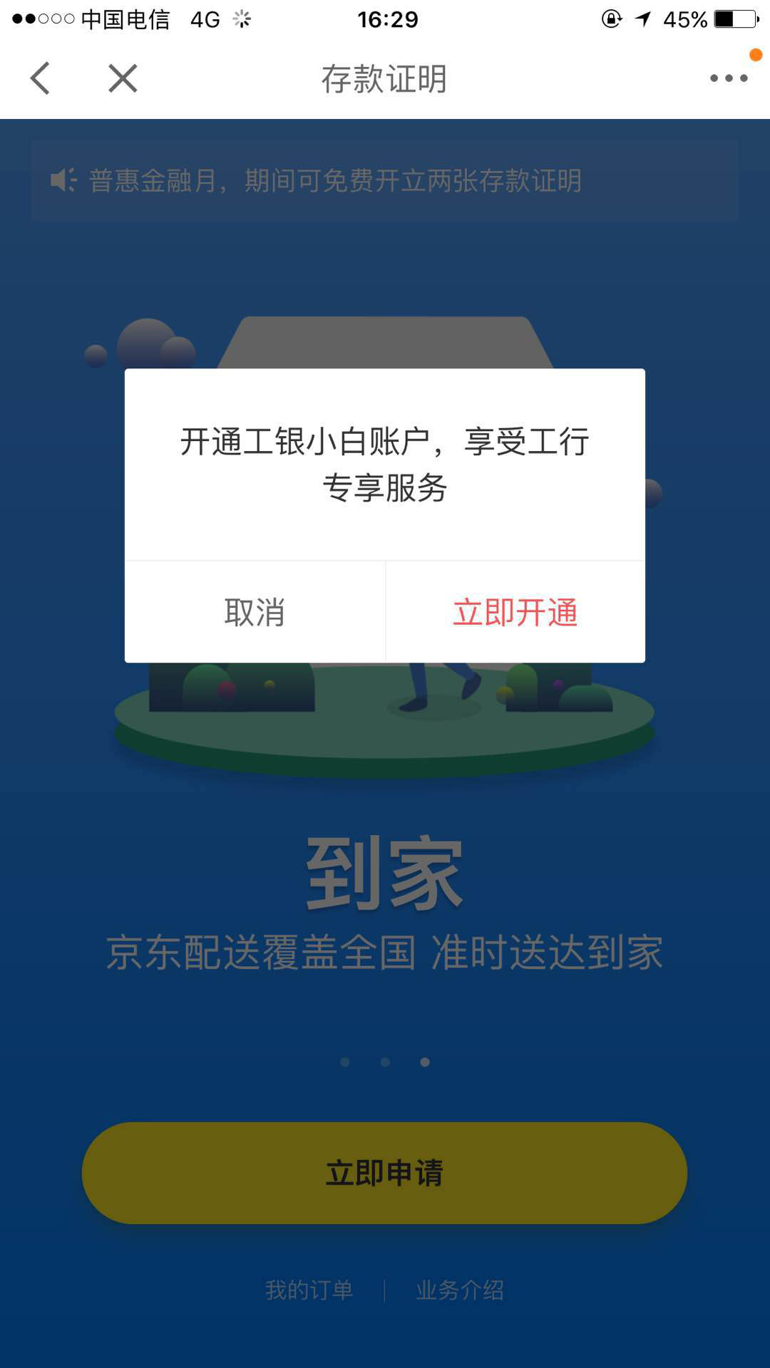 第二步:在打開界面中可以醒目明瞭的看到存款證明的浮動按鈕,在點開後的推廣頁面上,可以看到”線上申請轉入存款 到期自動回款“、”填寫資料支付費用 最快1分鐘申請成功“、”京東配送覆蓋全國準時送達到家“的介紹,並且在推廣期間可以免費開兩張存款證明。很好,自動回款、京東配送、免費,可以説是很智能了。