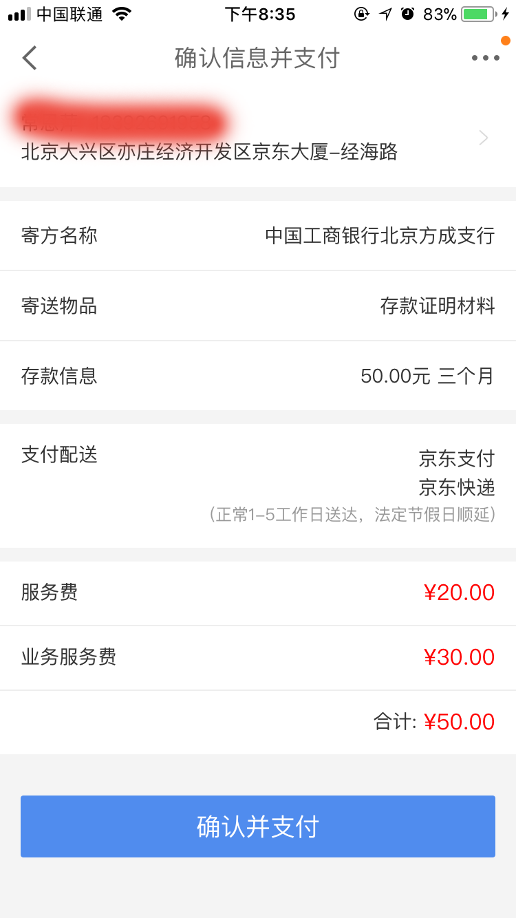第五步,確認姓名電話並支付相關的費用(前兩張申請免費),顯示支付成功,整個流程就辦理完畢了。在這個界面可以看到,正常情況下收費是50元,不過想想不用去銀行排隊,強大的京東物流還能保證當天送達,覺得也是可以接受的。
