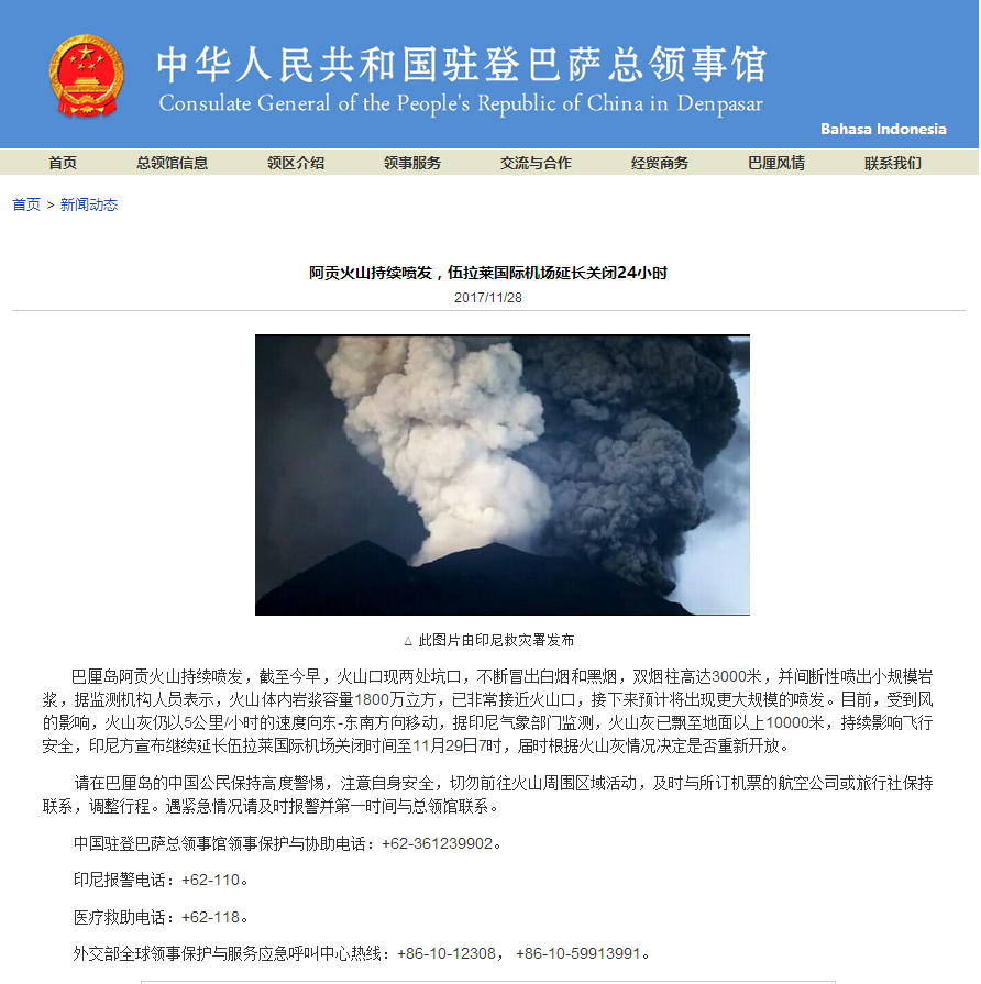 28日,中國駐登巴薩總領館再次發佈公告。具體內容如下:巴厘島伍拉萊國際機場臨時關閉24小時巴厘島阿貢火山持續噴發,截至今早,火山口現兩處坑口,不斷冒出白煙和黑煙,雙煙柱高達3000米,並間斷性噴出小規模岩漿,據監測機構人員表示,火山體內岩漿容量1800萬立方,已非常接近火山口,接下來預計將出現更大規模的噴發。目前,受到風的影響,火山灰仍以5公里/小時的速度向東-東南方向移動,據印尼氣象部門監測,火山灰已飄至地面以上10000米,持續影響飛行安全,印尼方宣佈繼續延長巴厘島伍拉萊國際機場關閉時間至11月29日7時,屆時根據火山灰情況決定是否重新開放。請在巴厘島的中國公民保持高度警惕,注意自身安全,切勿前往火山周圍區域活動,及時與所訂機票的航空公司或旅行社保持聯繫,調整行程。遇緊急情況請及時報警並第一時間與總領館聯繫。