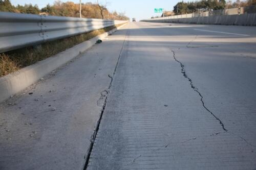 迎日灣大道大部分是混凝土路面,其餘部分為瀝青混凝土路面。車輛行駛後,瀝青混凝土路面會下陷,從而與混凝土路面產生高度差異,混凝土路面上還出現了許多裂痕。這些裂縫中不夾雜石頭和其他異物,往來車輛可以清楚地看到裂縫是最近出現的。