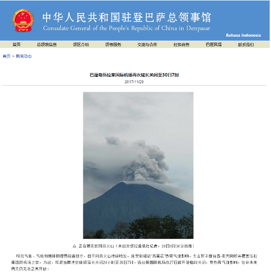 據海外網此前報道,中國駐登巴薩總事領館27日發佈提醒稱,巴厘島阿貢火山自11月21日首次噴發後,活躍強度不斷增強並多次噴發出大量火山灰,受火山灰影響,巴厘島伍拉萊國際機場於11月27日07:15至11月28日07:00期間(當地時間)臨時關閉,取消所有抵離航班。28日,中國駐登巴薩總領事館再次發佈公告稱,巴厘島伍拉萊國際機場臨時關閉24小時巴厘島阿貢火山持續噴發,截至28日早晨,火山口現兩處坑口,不斷冒出白煙和黑煙,並間斷性噴出小規模岩漿。印尼方宣佈繼續延長巴厘島伍拉萊國際機場關閉時間至11月29日7時,屆時根據火山灰情況決定是否重新開放。