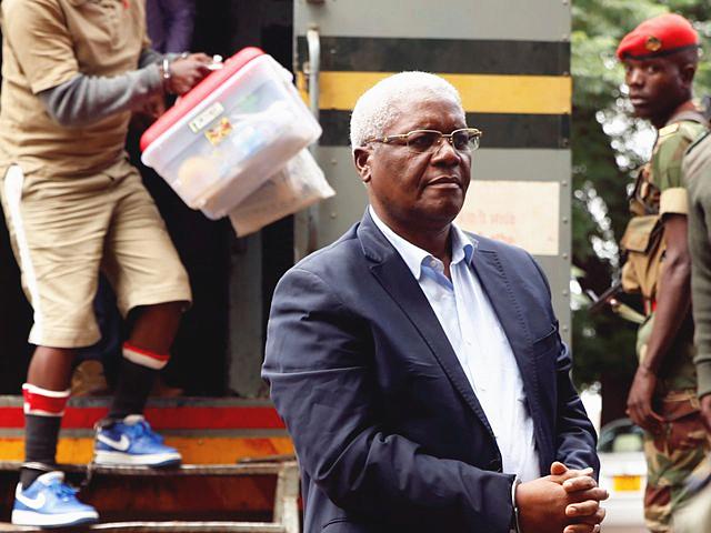 11月27日,哈拉雷,受到腐敗指控的津巴布韋前財政部長瓊博帶着手銬抵達當地一家法院。(新華/法新)