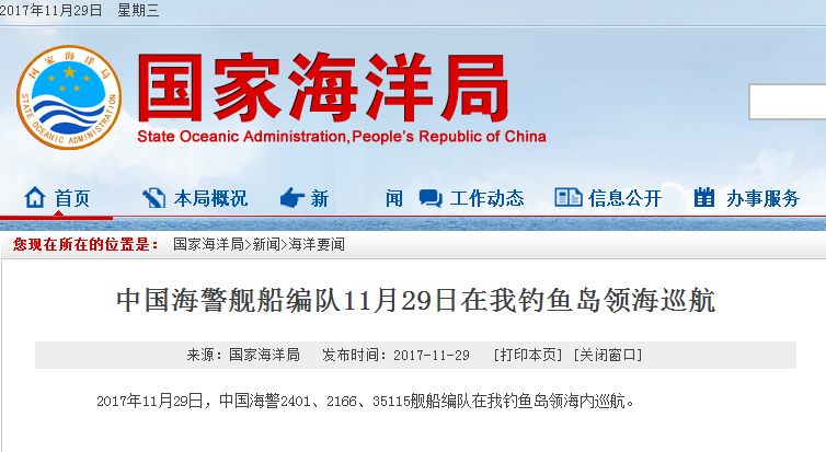 11月29日,中國海警2401、2166、35115艦船編隊在我釣魚島領海內巡航。就在昨日(28日),4艘中國海警船在我釣魚島海域外側毗連區巡航執法。中國海警艦船編隊上一次在釣魚島領海內巡航是在11月2日。這是中國今年第27次在釣魚島領海內巡航。