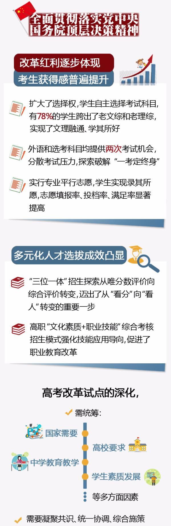 *2014年起,浙江作為全國首批高考綜合改革試點地區之一,承擔先行先試、探索經驗的任務。*該省率先在考試招生模式上進行改革:考試不再分文理,實行統一高考與高中學考、必考與選考相結合。錄取不分批次,實行“專業+學校”志願,按專業平行投檔。高校確定專業(類)選考科目範圍和其他選拔條件,擇優錄取;高職提前招生,普高學生以高中學考成績、中職學生以全省統一組織的職業技能考試成績作為選拔基本依據。實行一檔多投,實現學生和高校雙向選擇;深化三位一體招生改革,為綜合素質有優勢、學有專長的考生提供施展平台。