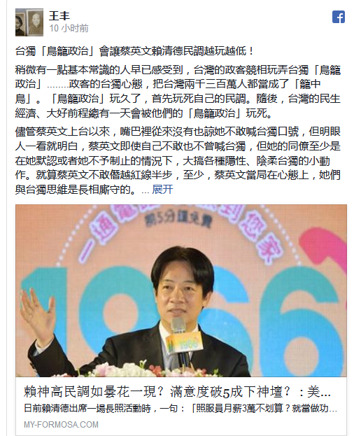 王豐在29日在臉書(Facebook)發文痛批民進黨搞固步自封、“鎖島自戀”的所謂“鳥籠政治”。他説,儘管蔡英文在台面上不曾喊過“台獨”,但在其默許的情況下,現在各種隱性、陰柔“台獨”的動作不斷,因此蔡英文當局在心態上算是與“台獨”掛勾。