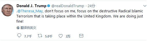 特朗普稱:“特雷莎,別盯着我,盯着你們英國國內的極端恐怖主義去。我們(美國)做得剛剛好!”