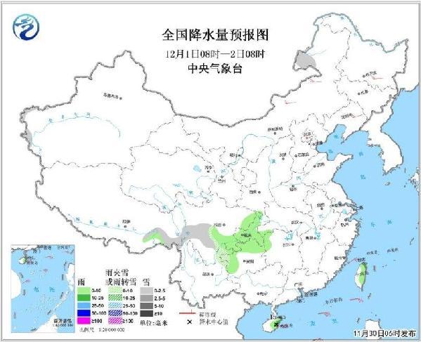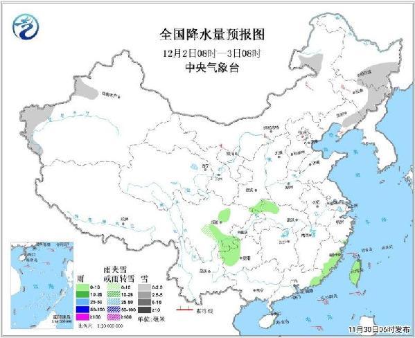 11月30日08時至12月1日08時,南方地區降雨減弱,陰雨天氣趨於結束。西南地區東部、江南大部、華南大部等地區有小雨或陣雨,局地中雨。東海南部、台灣海峽、台灣以東洋麪、南海東北部海域有7~8級、陣風9級的東北風。