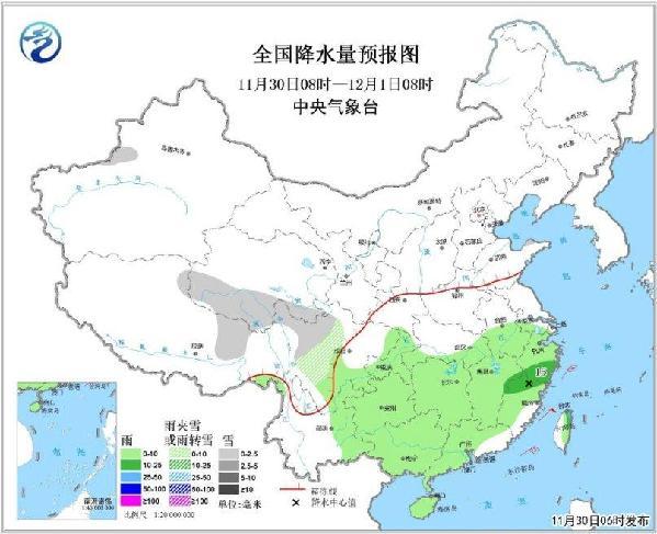 受南下冷空氣和低層切變系統共同影響, 30日長江以南大部地區仍有小雨或陣雨,浙閩局地有中雨。江南、華南等地的最低氣温或平均氣温將下降4~6℃,最低氣温預計出現在1日或2日凌晨。上述部分地區有4~5級偏北風;東海南部、台灣海峽、南海東北部等海域將有7~8級、陣風9級的東北風。