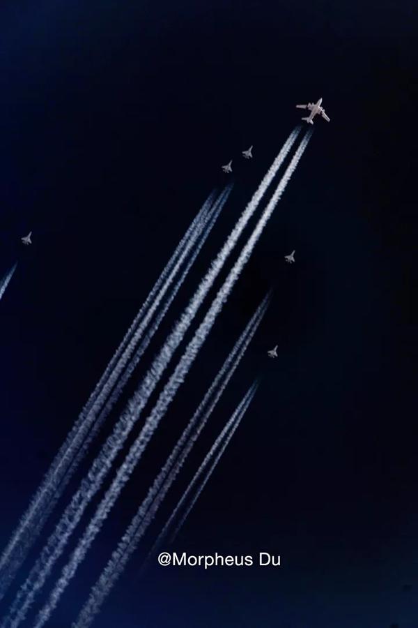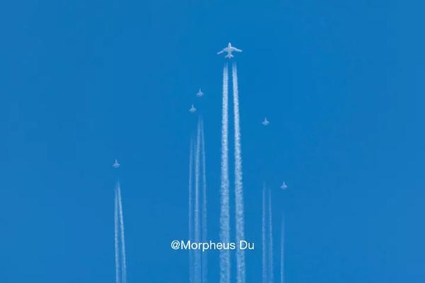 相機照片中5架蘇35S跟在一架伊爾76運輸機的引導下,從天津機場上空飛過,飛行高度在10000米以上。