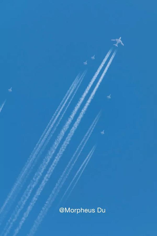 相機照片中5架蘇35S跟在一架伊爾76運輸機的引導下,從天津機場上空飛過,飛行高度在10000米以上。