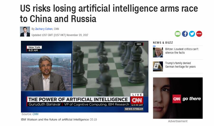 CNN11月29日以“在與俄羅斯、中國的人工智能軍備競賽中,美國面臨失敗的風險”為題稱,中國和俄羅斯將研發人工智能技術視為國家發展的重點任務,並已經開始利用人工智能加強其經濟和國防事務,但美國在該領域的投資不大,“恐難跟上這些國家的腳步”。
