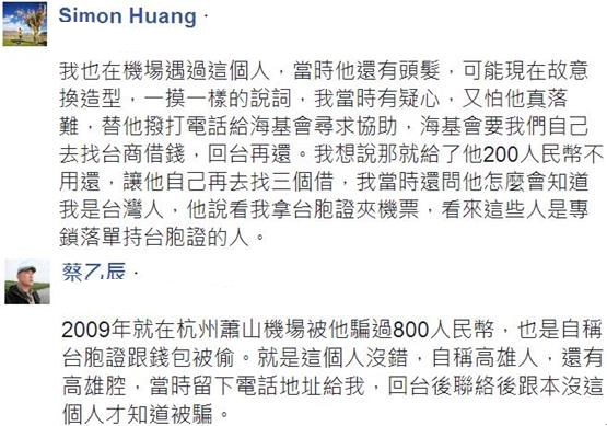 一名台灣網友在臉譜網發文稱,日前他到大陸觀光,一名身穿藍色牛仔外襯衫的中年男子,聲稱自己來自台灣高雄,並謊稱自己出差不小心弄丟了台胞證,需要借800元人民幣補辦。