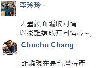 發文的這名網友表示“真的很丟台灣人的臉!”,呼籲其他去大陸旅遊的民眾要多注意,千萬別再受騙上當。也有許多台灣人表示“詐騙現在是台灣特產”“丟盡顏面騙取同情,以後誰還敢有同情心”。