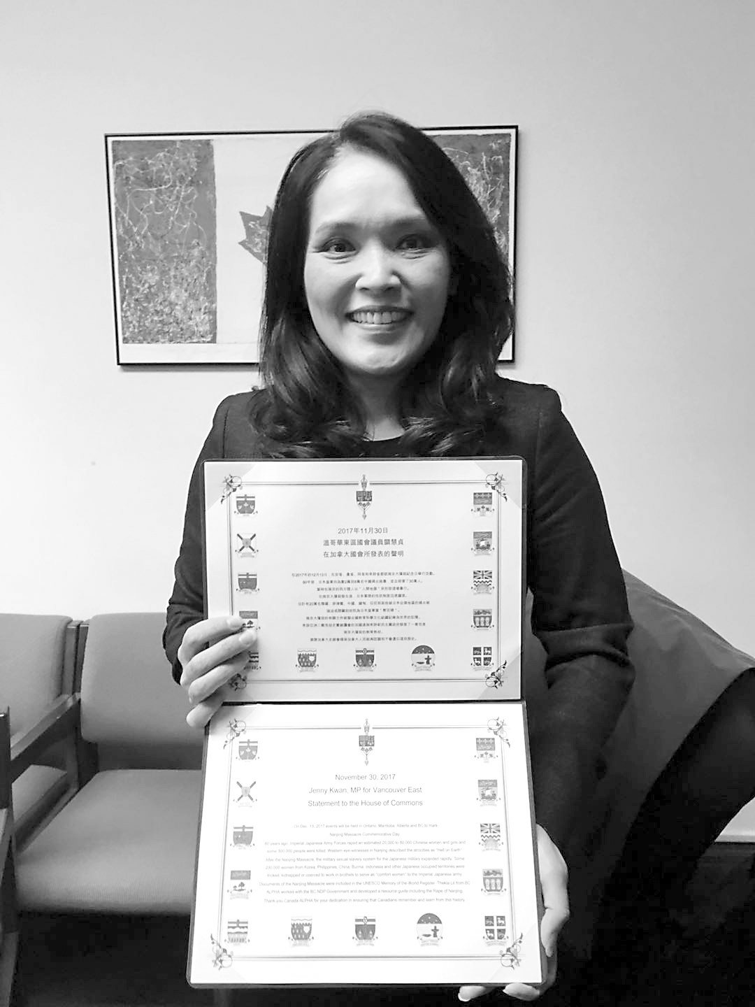 除了聯邦議會,今年加拿大安大略省議會通過了華裔議員黃素梅提出的南京大屠殺紀念日的動議。安大略省成為該國首個通過南京大屠殺紀念日的省。日本政府隨即對此表示“遺憾”。而在那之前,黃素梅原本提出的是議案,但由於日本官方阻撓及其他因素,改為不具法律約束力的動議。