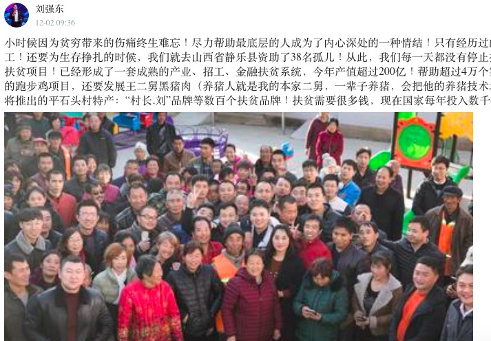 劉強東的小目標:明年幫助5萬户貧困家庭脱貧