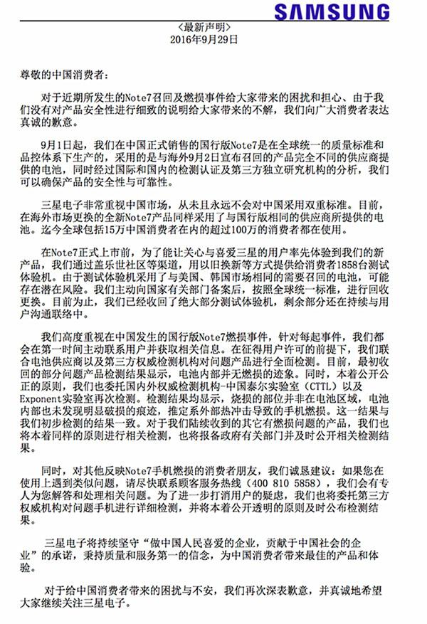 9月29日,中國三星電子發佈聲明,“對於燃損事件,由於沒有對安全性進行細緻説明,我們表達真誠歉意。”隨後寫道,“我們可以確保產品的安全性和可靠性”,“從未使用雙重標準”。