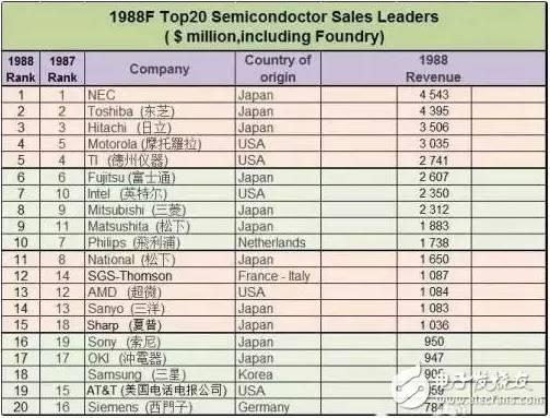 需要注意,在1988年的榜單中,韓國三星首次殺入全球半導體TOP20。