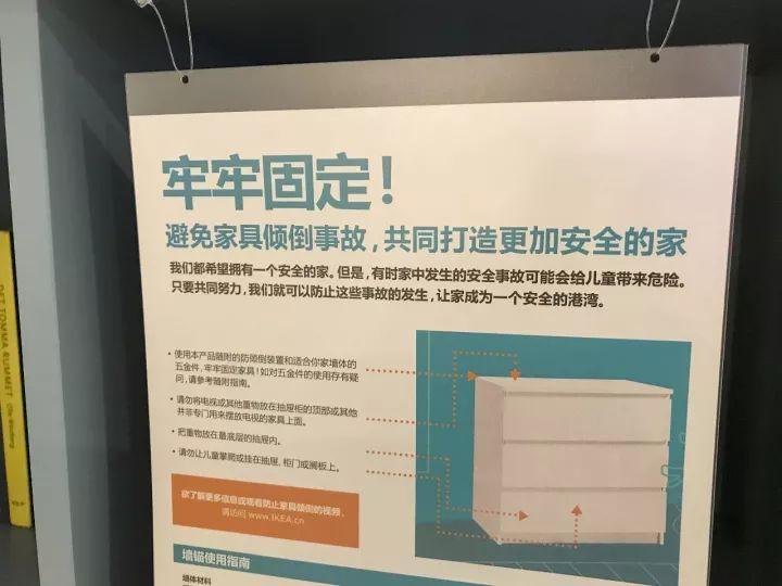 宜家方面介紹,現在顧客在宜家商場購買該產品時,銷售人員也會對其進行相關提醒。“我們要強調的是,宜家這個抽屜櫃只要牢牢固定在牆上,是沒有安全和質量問題的,任何高於75公分的抽屜櫃在沒有固定的情況下,站上去都有傾倒的可能。”朱昌來表示:“整個家居行業都存在類似風險,現在要做的就是警示風險的存在,喚醒大家對傢俱安全的重視。”