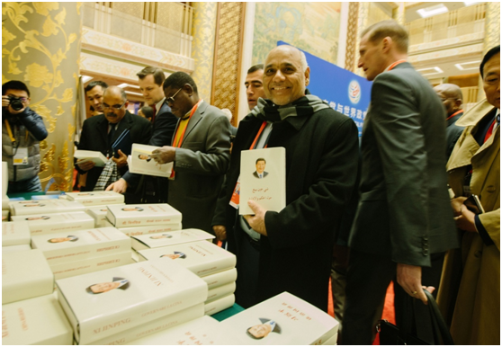 北京已進入寒冬,釣魚台國賓館裏的池塘都結上了薄冰。這樣的天氣卻與上週六國賓館芳華苑大堂內的氣氛形成鮮明對比。“西語版的再來3本!”“請問還有斯瓦希里語的嗎?”“麻煩拿一本英語,一本法語的,謝謝!”……這是位於大堂左側的櫃枱正在發放《習近平談治國理政》的熱鬧場景,來自各國的政黨代表都在爭先恐後地領取這本中國國家領導人的著作。一名非洲代表捧着3本書,難掩喜悦之情地對《環球時報》記者説:“我要帶回去給同事和朋友。只可惜這本書很厚,我擔心托運行李超重,沒辦法帶太多。”第二天,記者再去這個櫃枱時,書籍已被領完。