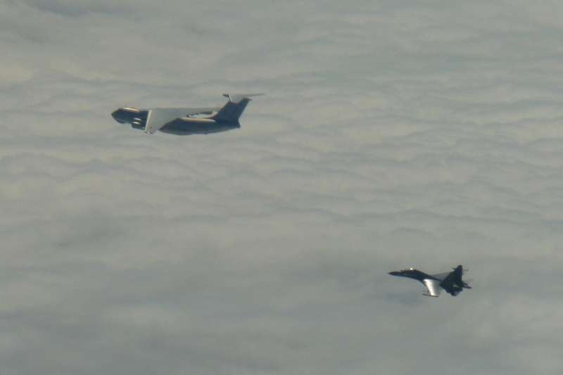 11月20日,解放軍出動IL-78空中加油機,伴隨演練對蘇30戰鬥機進行空中加油。(來源:台媒資料圖)