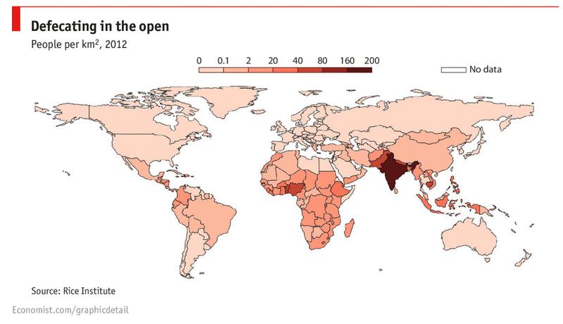 而英國《經濟學人》近年公佈的一項“露天排便”調查結果也顯示,*世界各國平均每公頃的“露天排便”人口比例,印度要遠遠高於其他國家,包括非洲國家在內。*如下圖所示,在印度,每平方公頃“露天排便”的人口數量為200人。即便拋開非洲國家人口密度小等問題,就是人口密度遠大於印度的孟加拉國,狀況也比印度要好得多。