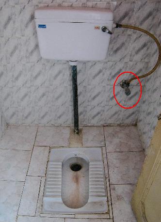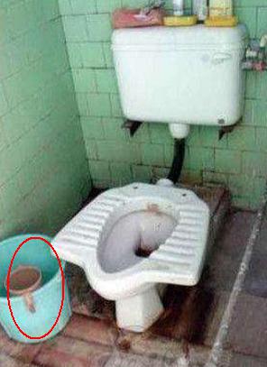 尤其是在露天場所解決基本問題的印度人,通常隨身都會攜帶一個裝水的容器。問題解決後,會用右手拿着容器,覆蓋到相關部位,再用左手進行清洗。而在印度的公共衞生間,絕大多數也並不放置紙巾,而是配備一個小瓢加小桶,更好一點的配備一個小小的噴水龍頭,以供沖洗之用。