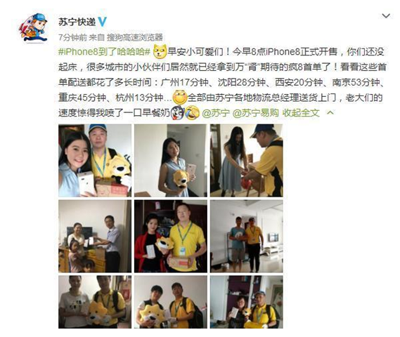 雖然貧窮限制了我的想象力,但沒有限制廣大網友的購買力。數據顯示,截至目前,2017年蘇寧累計包裹量已超25億。其中,最快的一件包裹產生於9月22日iPhone 8開售當天,僅用了13分鐘,杭州的宋女士就收到了剛剛下單的iPhone 8。這樣的蘇寧速度,讓你分分鐘拿到朋友圈炫富大賽冠軍。