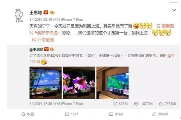 此外,蘇寧全國配送的最大件的包裹,是王思聰同款的100寸索尼電視。大彩電的配送,不僅讓蘇寧送裝一體的專業服務獲贊,與王思聰關於到底哪台才是全球第一台的“口水戰”,也讓眾吃瓜羣眾看得津津有味。