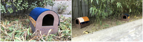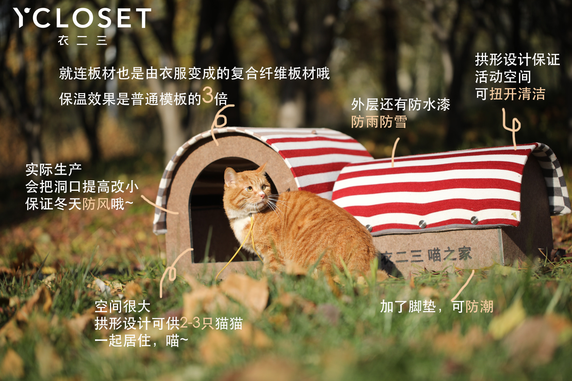 衣二三歷時一個月的時間,聯合一JIAN公益聯盟以及它基金, JEMO DRESSING等合作伙伴最後完成了這隻貓窩 – 一個從板材結構到螺絲扣固定都是用閒置的衣服布料改造而成的,堅固、防風、防潮、防水的貓窩。在發起本次活動之前, 衣二三已經率先捐出一批殘次品,改造成了第一批貓窩,聯合它基金以及高校動物保護協會率先投放在了北京部分高校中。城市青年社交平台Someet, 社會創新機構BottleDream、北京領養日、京東公益 、自如、ofo、領英、真格等其餘30多家企業也紛紛加入推廣活動中。