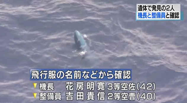 11月29日,日本航空自衞隊發佈消息稱,無人探測器在墜落現場附近海底約700米處發現1名疑似自衞隊員的屍體,其身上穿有訓練和執行任務時的綠色飛行服,但由於當時風高浪大並未立即打撈。12月3日下午,日本航空自衞隊在事發現場附近700米海底發現並打撈上來1人,經確認為失蹤人員。4日下午,日本航空自衞隊又在附近700米海底發現並打撈上來1人。從飛行服上的姓名來看,2人分別為機長花房明寬3等空佐(42歲)和維修員吉田貴信2等空曹(40歲)。