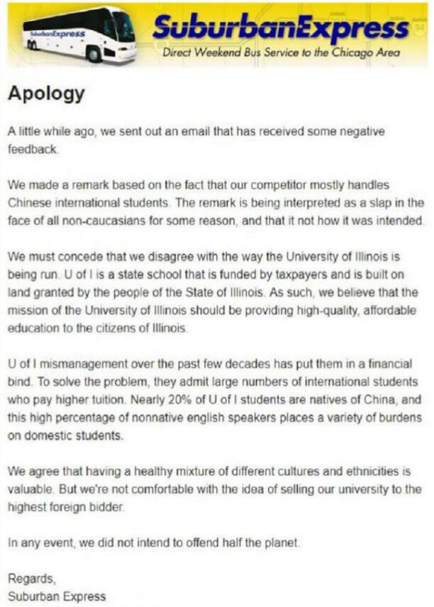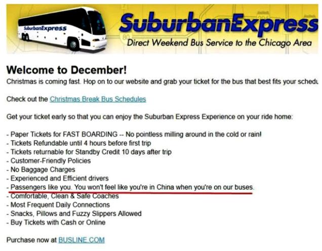 【環球網綜合報道 記者 張驁】本月2日,美國伊利諾伊州一個接送伊大香檳分校學生來往芝加哥的巴士公司發送了一封廣告電子郵件,裏面的廣告詞有些匪夷所思:“乘坐本巴士不會讓乘客感覺自己身在中國。”事件於12月4日被美國媒體曝光。美媒稱,這家巴士公司在廣告電郵中發表歧視中國人的言論,引發校內中國學生不滿。
