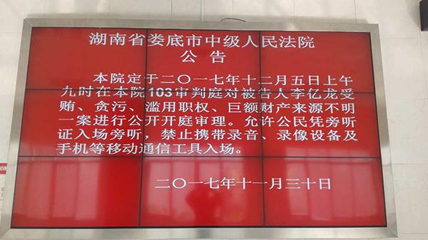 澎湃新聞(www.thepaper.cn)從湖南婁底市中級人民法院獲悉,該院於12月5日上午一審開庭審理中共湖南省委員會原委員、衡陽市委原書記、省委農村工作領導小組原副組長李億龍(正廳級)受賄、貪污、濫用職權、鉅額財產來源不明一案。