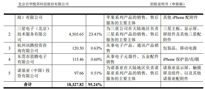 在百華悦邦前發佈的2014年報中披露,當年向主要供應商“三星電子(北京)技術服務有限公司”採購了4430 萬元,佔同年採購總額的比重為 23.30%,而該公司在本次招股説明書披露此項數據為採購額則高達4505.65萬元、佔同年採購總額的比重為23.41%,兩次信息披露存在一定差異。