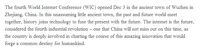 12月3日,第四屆世界互聯網大會在中國浙江省的古鎮烏鎮開幕。在這裏,過去和未來世界相遇,歷史與科技交織、使得現在與未來融為一體。互聯網即是未來,面對第四次工業革命,中國不僅不會缺席,還會深入參與繪製這一驚人的創新藍圖,構建人類命運共同體。