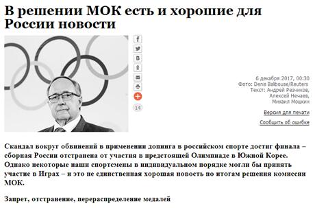 報道還稱,俄聯邦委員會國防和安全委員會第一副主席克林採維奇直言道,國際奧委會的這一決定是要將俄羅斯同世界體育“隔絕開來”。他稱,俄羅斯這樣的大國沒必要“隱姓埋名”地前去參加冬奧會,“這是企圖孤立俄羅斯的新嘗試”。俄國家杜馬議員列別傑夫呼籲俄羅斯運動員抵制奧運會。他稱奧委會的決定是對俄羅斯的“侮辱”,俄羅斯有必要採取嚴厲的回應措施,“在我看來,最好的方法就是完全拒絕參加奧運會”。