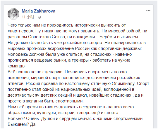 俄羅斯外交部發言人扎哈羅娃也在臉書發文對此回應説,人們能夠想象這樣的決定會對俄方運動員造成怎樣的痛苦。就像此前的世界大戰,前蘇聯解體以及對俄製裁一樣,此次事件並不會擊倒俄羅斯,俄羅斯總是能夠生存下來,“這樣的決定會讓我們痛苦嗎?是的,的確非常痛苦,但我們會與運動員的身體和靈魂在一起。我們能繼續生存下去嗎?當然”。
