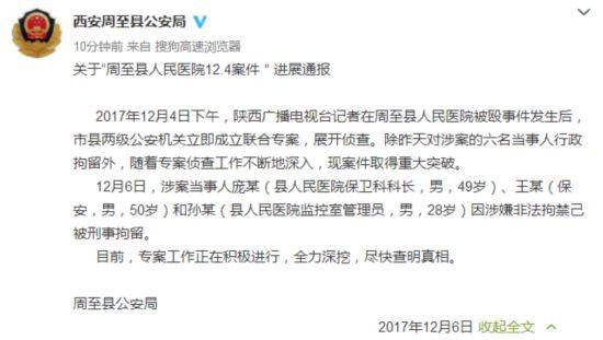 2017年12月4日下午,陝西廣播電視台記者在周至縣人民醫院被毆事件發生後,市縣兩級公安機關立即成立聯合專案,展開偵查。除昨天對涉案的六名當事人行政拘留外,隨着專案偵查工作不斷地深入,現案件取得重大突破。