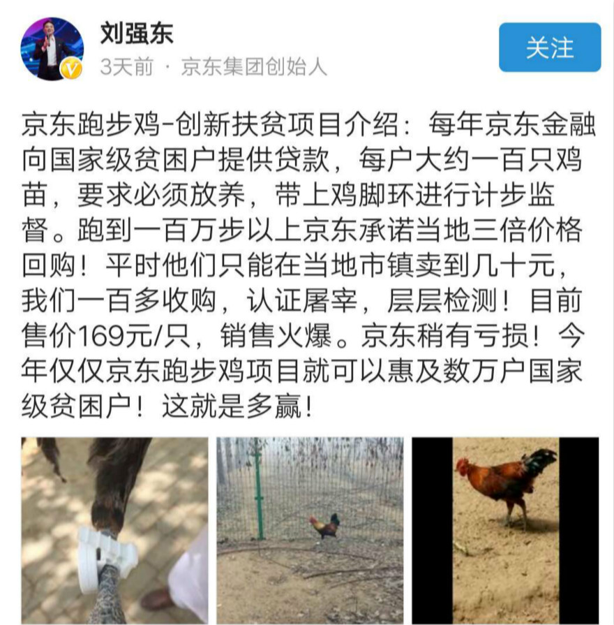 劉強東在闡述京東的跑步雞計劃時表示:京東的雞必須要求放養,併為雞帶上了腳環進行計步,只要達到了100萬步以上,京東會以三倍的價格收購。