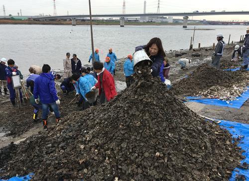 12月4日,約70名“江户川水面保護協會”的志願者參與清理河岸被丟棄蠔殼,這些由當地政府人員及居民組成的志願者在不到5個小時內清理了30噸耗殼,據估算,在大約1公里被丟滿耗殼的河岸內堆積了100噸的耗殼。