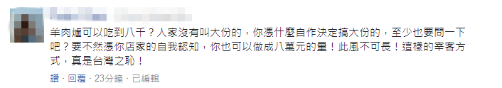 “羊肉爐可以吃到8000?人家沒有叫大份的,憑什麼自作主張決定搞大份的,至少也要問一下吧?……這樣的宰客方式,真是台灣之恥。”(綜編/海外網 鞏浩)