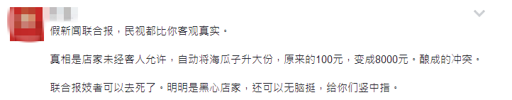 “假新聞聯合報,民眾看得都比你客觀真實。真相是店家未經客人允許,自動將海瓜子升為大份,從原來的100元變成8000元,才釀成的衝突……明明是家黑店。”