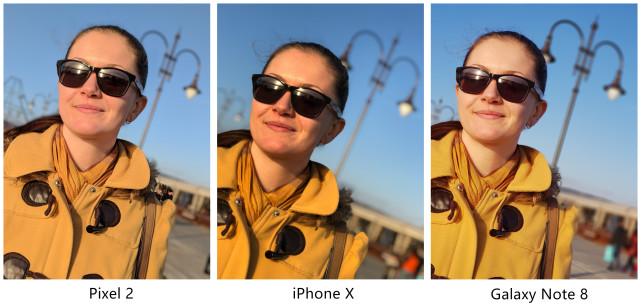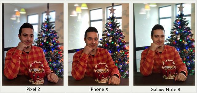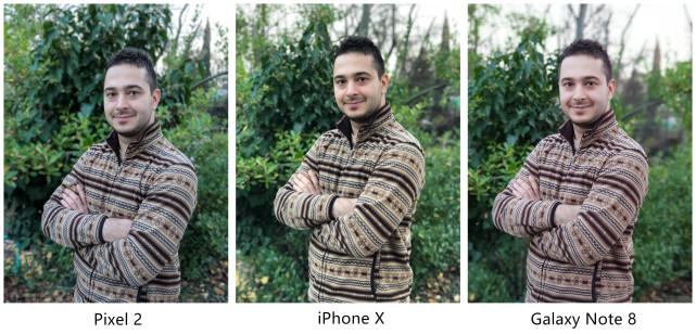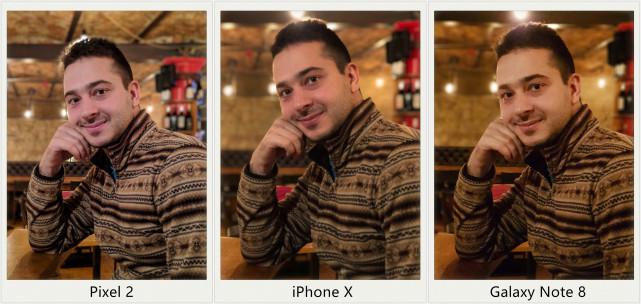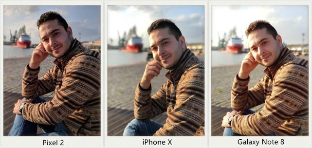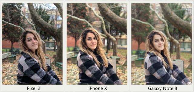 在這一組照片中,谷歌Pixel 2再度展現了人工智能處理髮絲的神奇能力,另外兩部手機在頭髮上就沒能這麼精細。而iPhone X和Note 8在背景虛化上做得要比Pixel 2明顯得多。