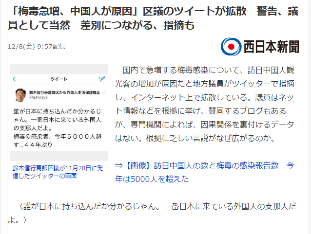 據《西日本新聞》12月8日報道,東京葛飾區區議員鈴木信行在推特上聲稱,近10年以來,日本國內梅毒的發病率跟赴日中國遊客的增長速度一樣。“中國遊客”是日本國內梅毒蔓延的“外因”。