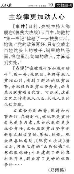 12月7日,《人民日報》第19版刊登文章《主旋律更加動人心》,專題點評河南衞視《脱貧大決戰》節目,文章對河南廣電在脱貧攻堅中的作用與表現形式給予了充分肯定,認為節目“深入貧困山區,看到了鮮活的脱貧故事,節目中邀請的特約記者敬一丹、張凱麗、牛羣等積極為脱貧攻堅奔走,還自願為脱貧項目代言。可以説,這是文藝工作者深入生活、紮根人民的生動實踐”。並稱贊節目形式創新“在新時代,媒體既是宣傳者也是參與者,應當承載起更多社會責任,比如在脱貧攻堅中創新形式積極宣傳、帶動、鼓舞”。
