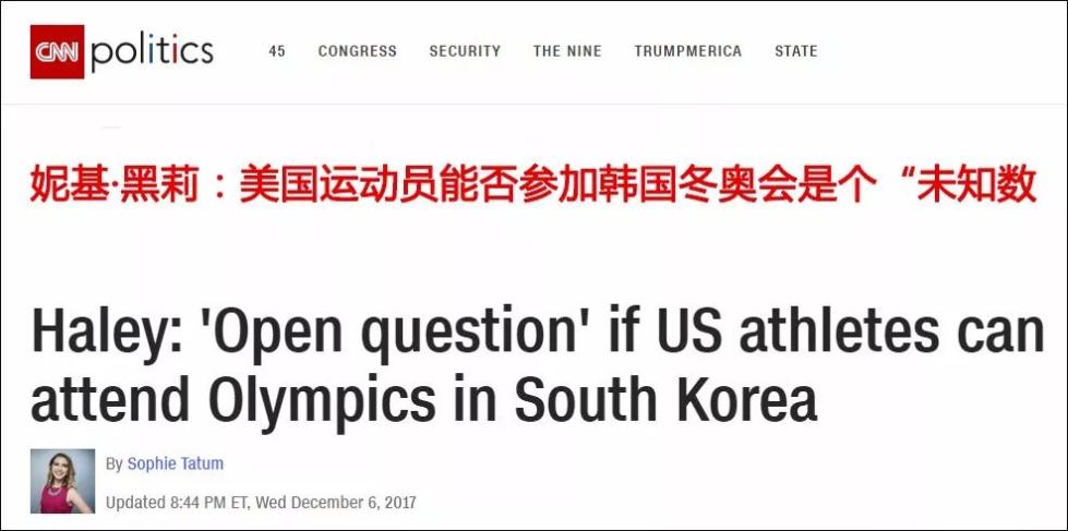 此前一天,美國常駐聯合國代表尼基⋅黑莉也稱:“受朝鮮威脅的影響,美國代表團是否參加平昌冬奧會仍是疑問。”